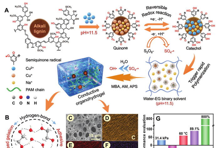 研究表明,在极端环境中耗时且耗能的聚合方法及差的适应性严重阻碍了导电水凝胶在电源领域的实际应用。有鉴于此,国产色情 邵长优博士和北京林业大学彭锋教授团队本文设计了一种基于碱木质素(AL)大分子的简便通用的自催化体系(AL-Cu2+),用于在碱性水-乙二醇(…